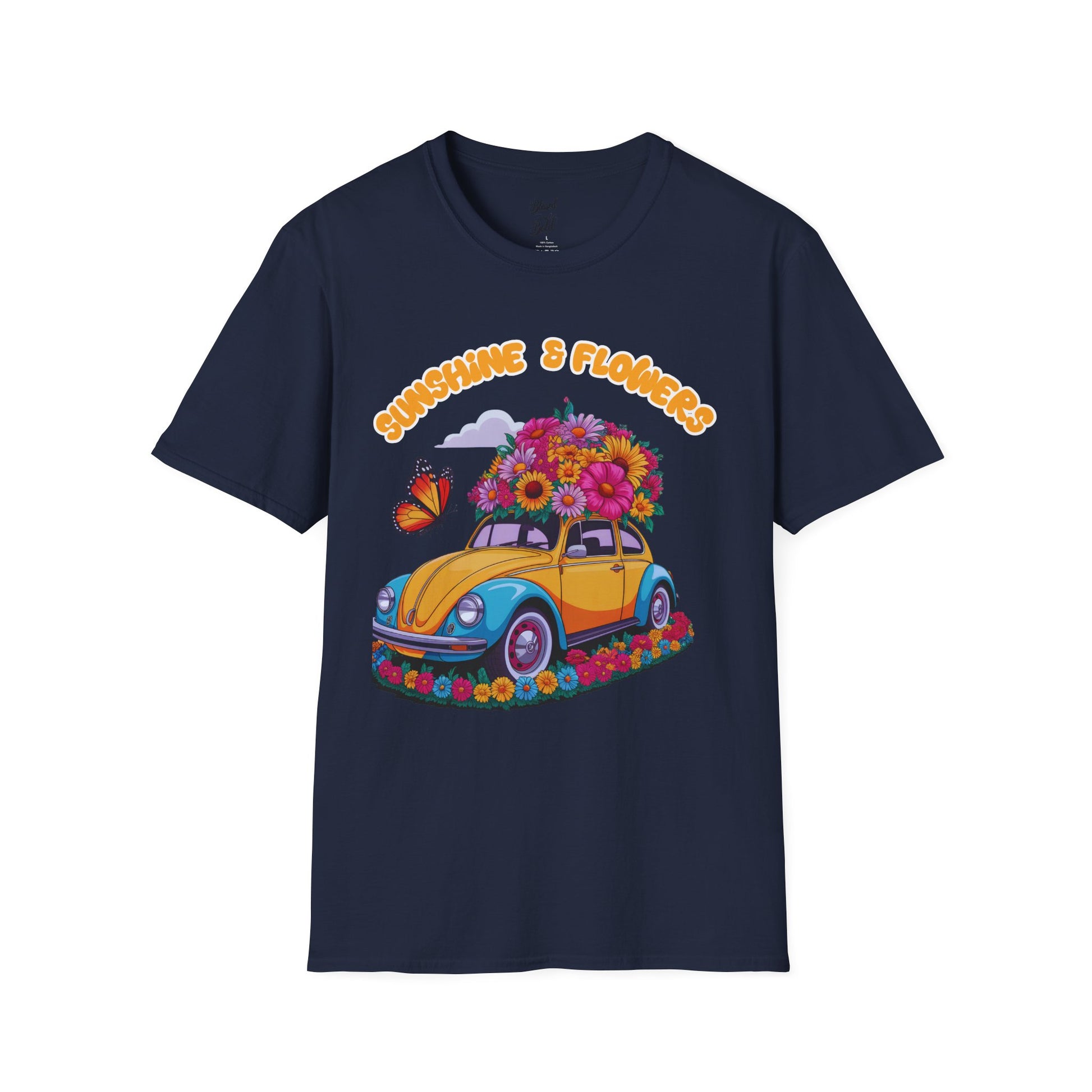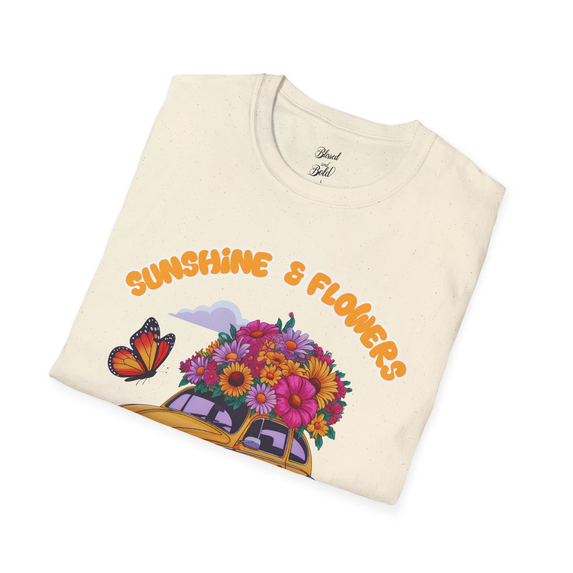 SUNSHINE & FLOWERS unisex softstyle T-shirt made from durable and smooth fabric, perfect for printing. The classic fit and crew neckline offer versatile style for any occasion, delivering a blissful wearing experience. Ideal for adults looking for a comfortable and stylish tee.